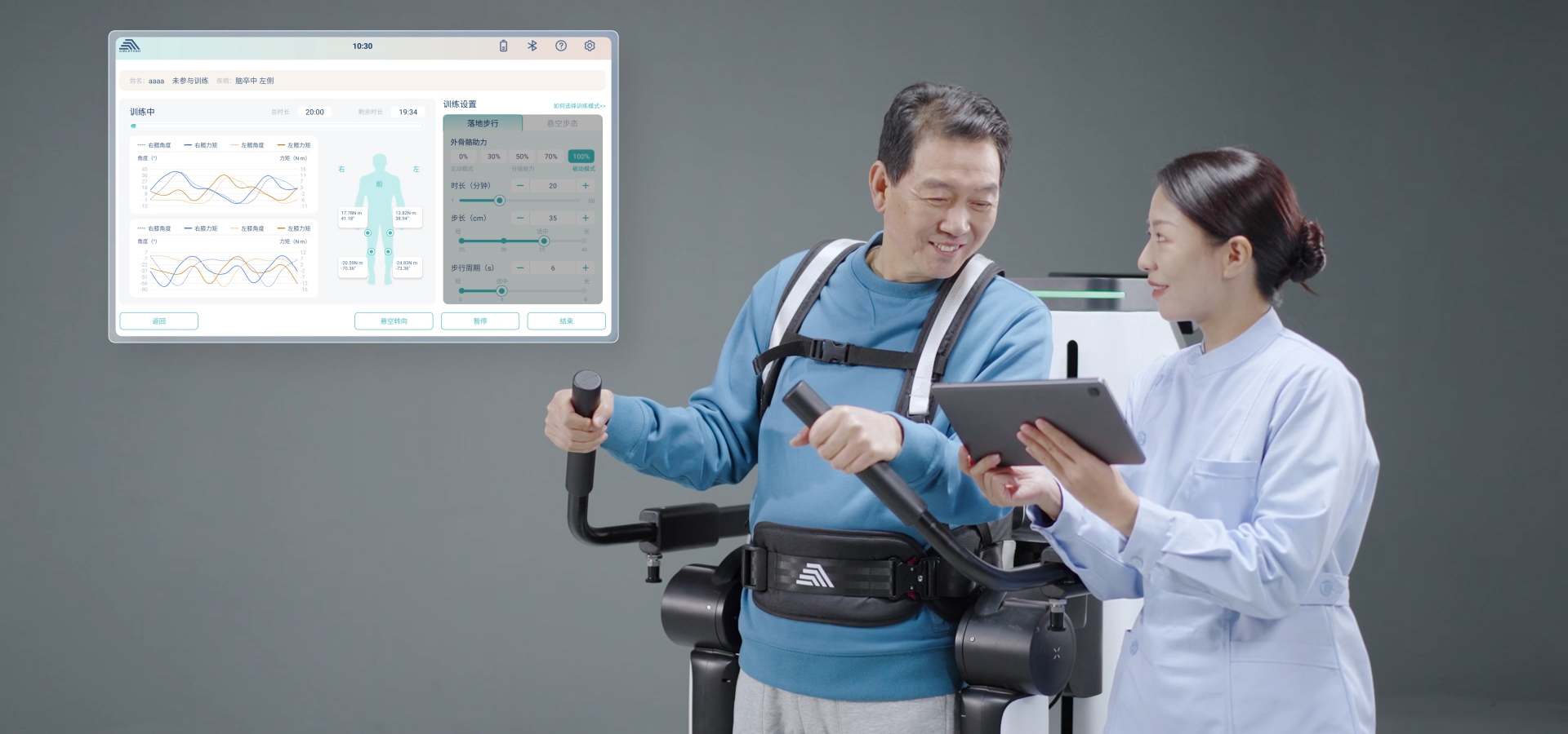 采用一體化人體工學設計,結合自研的個性化仿生步態數據模型,通過高性能執行器和控制算法驅動步態機械腿,在康復早期為每位用戶匹配不同的節律性步行增 強其本體感覺輸入,促進神經系統的重組和代償。